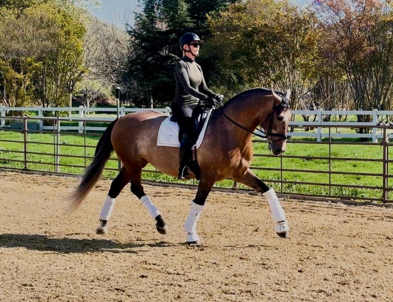 He is 16’1 grey ( currently a striking Buckskin/Roan ) schooling third level movements, easy laterals, nice trot extensions and has a good start on a flying change. He is comfortable, sensible, forward thinking, fun to ride and always wanting to connect with his rider. He is suitable for a professional, amateur or JR/YR. Perfect ground manners, very sweet to be around, great on trails, over cavalettis and excellent with seat lessons. Located in Los Angeles area. Contact Caroline Hoffman 818-3269001 chcarolinehoffman@gmail.com