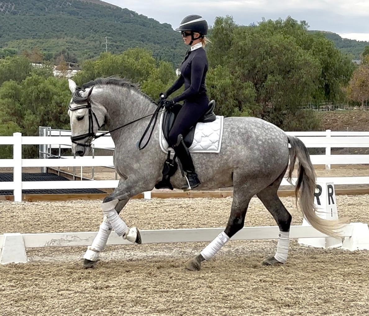 2019, 16 hands, dark grey PRE mare with excellent bloodlines Kabileño VIII - Atlántico PAL with three quality gaits, a super walk, great canter and expressive trot with a nice trot extension. She is very willing, smart, brave, levelheaded and is extremely comfortable to ride with a forward thinking mindset. She is first level schooling second/third level movements and has a good start on a flying change. She is very good on trails, cavalettis, riding in new places and would do well for an amatuer or junior rider in a training program that wants to move up the levels. She is showing good potential to be a FEI horse , is sweet, easy to handle, a barn favorite that’s very personable and connects with her person. Located in Los Angeles area